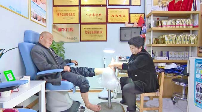 永安路街道崇德社区居民许桂花说:“她给我修脚修得好,对我也好,我早晚到店里去,喝水呀泡脚啊,对我好得很,对我好的跟亲孙女一样,娃确实不管是对老人们态度好,性格好,修脚也很好,啥都好。这